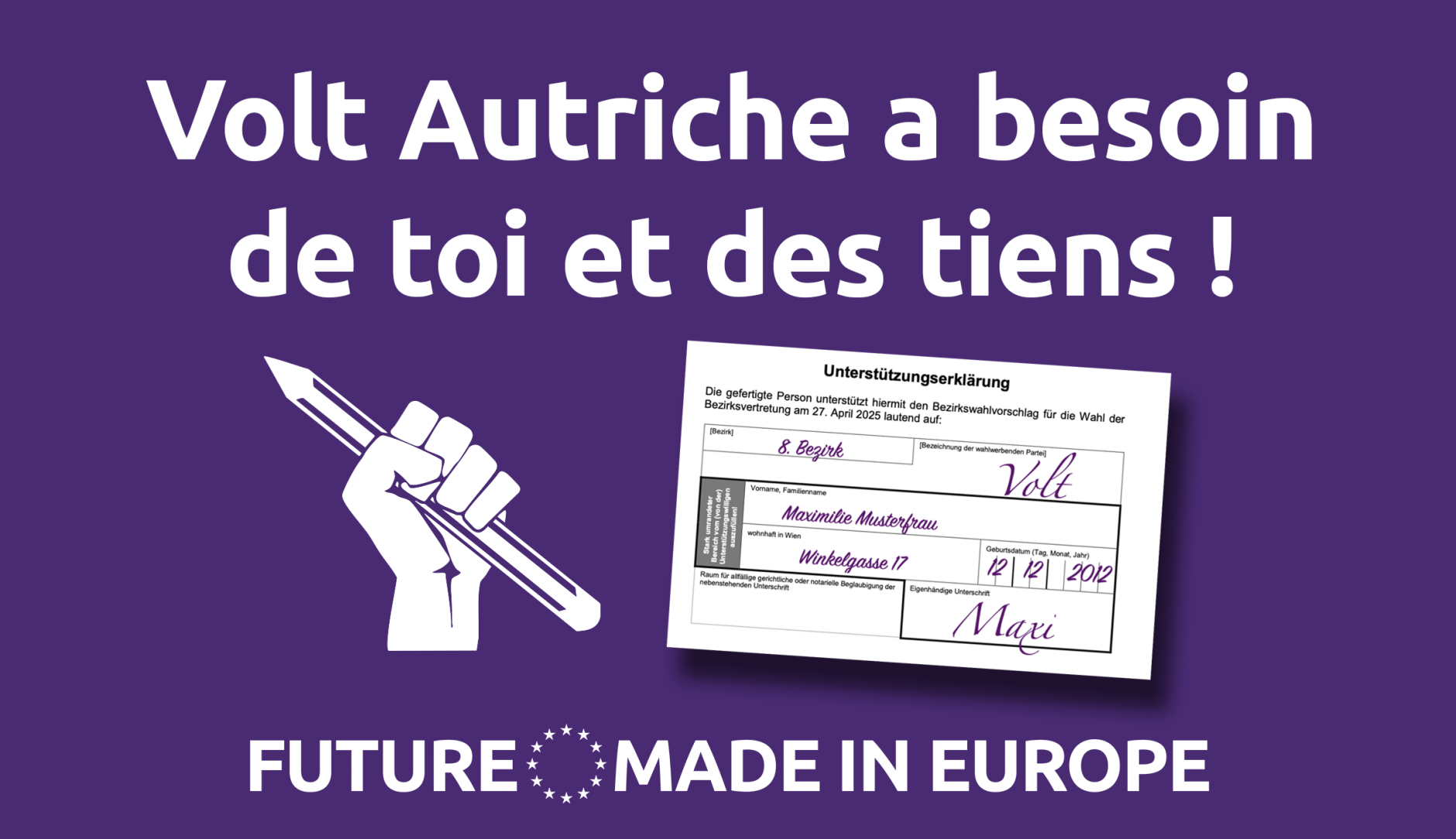 Talk to your friends, family and acquaintances in Vienna and ask them to sign for Volt from January 28 to February 24.