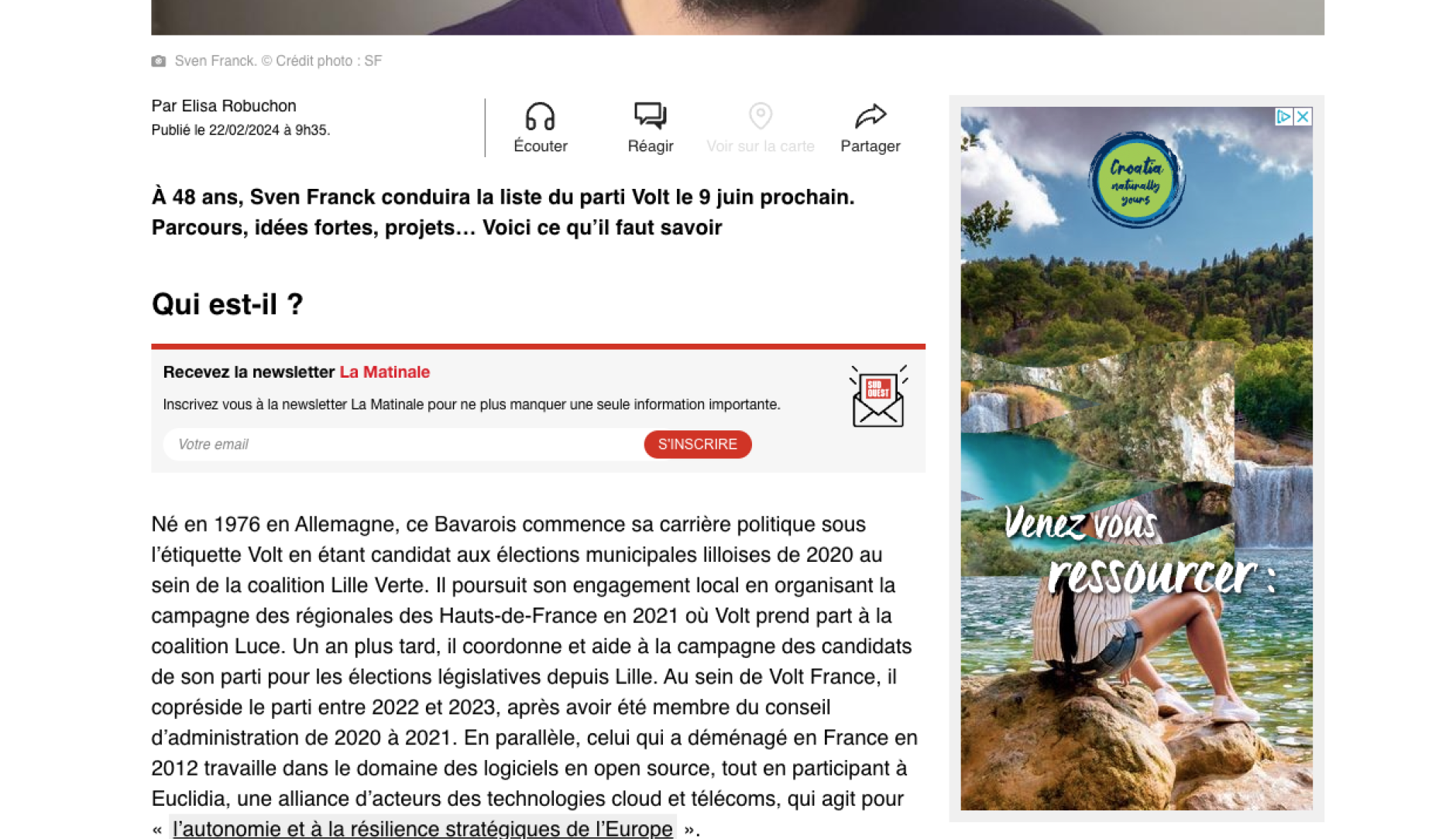 Ouest France – Qui est Sven Franck, le candidat du parti Volt ?