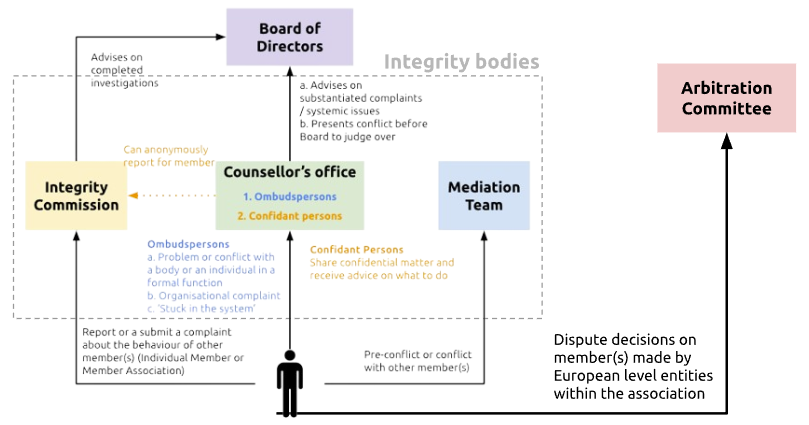Si vous ne parvenez pas à résoudre un problème d'intégrité ou un litige avec l'aide d'un autre membre ou dirigeant de Volt, veuillez contacter [email protected]. Derrière cette adresse e-mail se trouvent les médiateurs, qui vous aideront à accéder à l'organisme chargé de l'intégrité approprié. Si vous savez déjà à qui vous adresser, vous pouvez envoyer un e-mail directement à l'organisme concerné.